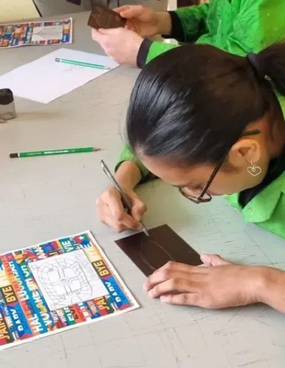 Op donderdag 10 februari ging eindelijk de eerste excursie van dit schooljaar wel door. In het oude Delfshaven volgden de leerlingen van klas 1 en 2, apart van elkaar, de workshop etsen. In de Fabriek gelegen aan de Schie leerden de leerlingen hoe te etsen. Bij binnenkomst gingen de leerlingen hun schildersjassen aantrekken om vervolgens een filmpje te bekijken over hoe etsen in zijn werk gaat. Daarna gingen iedereen snel zelf aan de slag. Eerst moest er een ontwerp gemaakt worden. Een tekening met iets van jou of met wat met verleden te maken heeft. Toen dat klaar was kregen de leerlingen een metalen plaatje met daarover een waslaagje. Daar moest weer de schets die net gemaakt was, op over gekrast worden.