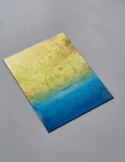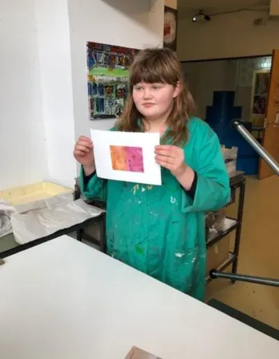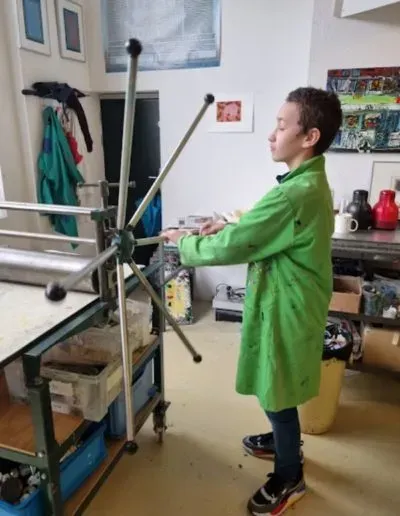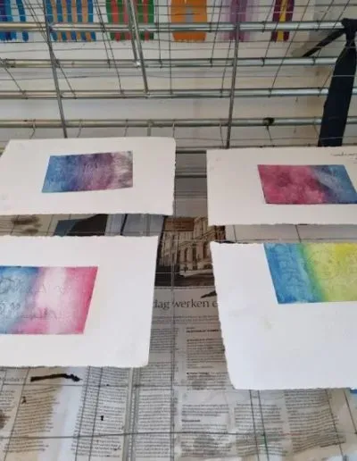 De volgende stap is je metalen plaatje in een zuur bad leggen. Dat maakt dat je ingekraste tekening scherper wordt. Na een kwartiertje wachten kon het ijzeren plaatje ingesmeerd worden met verf. Toen dat plaatje weer afgeveegd was, kon de afdruk gemaakt worden. Je plaatje ligt dan op de pers tafel op papier en als je draait aan een wiel dan wordt je tekening afgedrukt. Dit klinkt heel eenvoudig maar er komt nog wel heel wat bij kijken. Je moet je plaatje niet te dik, maar ook niet te dun insmeren met verf. En zo zijn er nog meer dingen waar je goed op moet letten. Dat had iedereen gelukkig heel goed gedaan en zo werd het eindresultaat heel kleurrijk en bijzonder. De twee uren vlogen voorbij. Het zinken plaatje mocht mee als souvenir. De etsen voorzien van de handtekening van ‘de artiest’ ook.