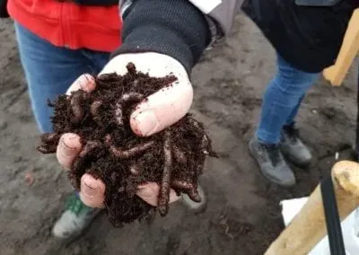 De bomen stonden al op de goede plek, maar er moest nog wel aarde bij geschept worden. Een mooie taak voor onze leerlingen. Daarna hebben de leerlingen wormen aan de voet van de bomen gezet, wat helpt om de bodem luchtig te houden.