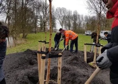 In de ochtend zijn we met een busje van de gemeente Rotterdam naar de Rekerdijk gereden, in de wijk Groot IJsselmonde, om 3 berkenbomen te planten. Het planten van de bomen werd feestelijk geopend door Ingeborg Berger, programmamanager van Rotterdam Circulair.