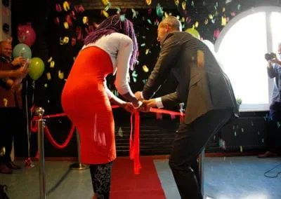 Wethouder S. Kasmi van Onderwijs opende het lunchcafé van Accent VSO Op Noord en onthulde de naam ervan samen met een leerling van de school.